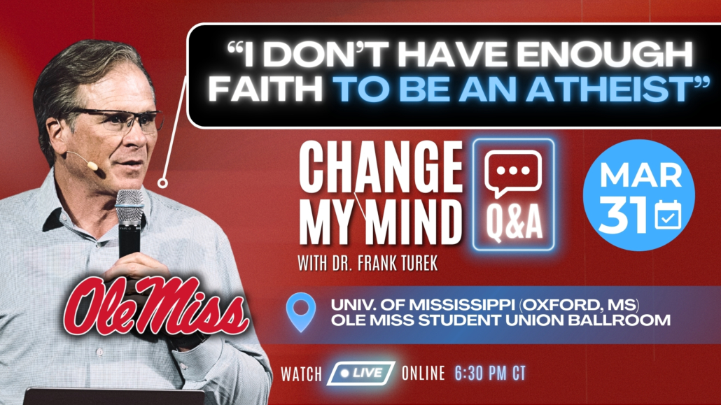 Does truth exist? Does God exist? Are miracles possible? Is the New Testament reliable? Join Dr. Frank Turek for a short presentation on the 4-point case for Christianity delivered on TUES. 3/31 at the University of Mississippi (Jackson, MS). More details will be added soon on the time and location on campus. There will be time for Q&A at the end of the presentation. This event is FREE and open to the public but space is limited so please arrive early to get your seats!